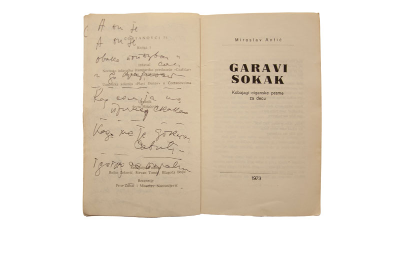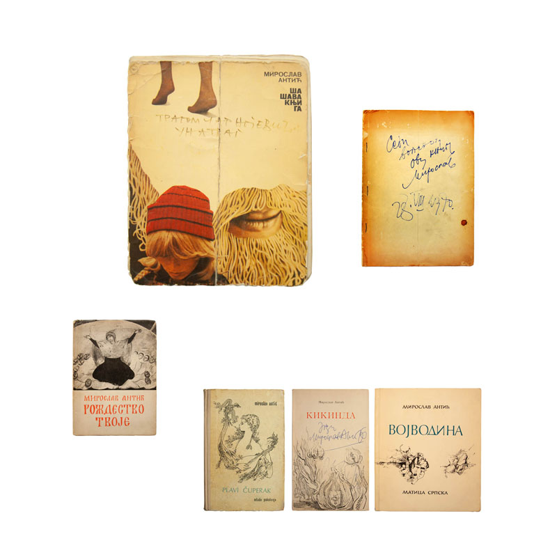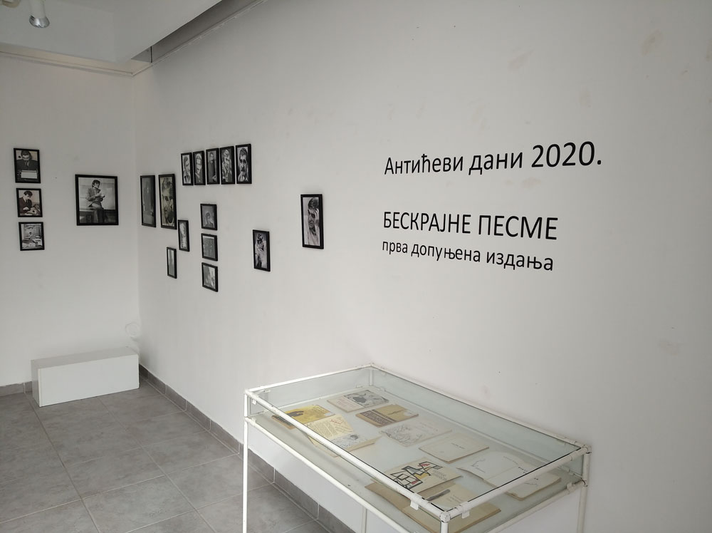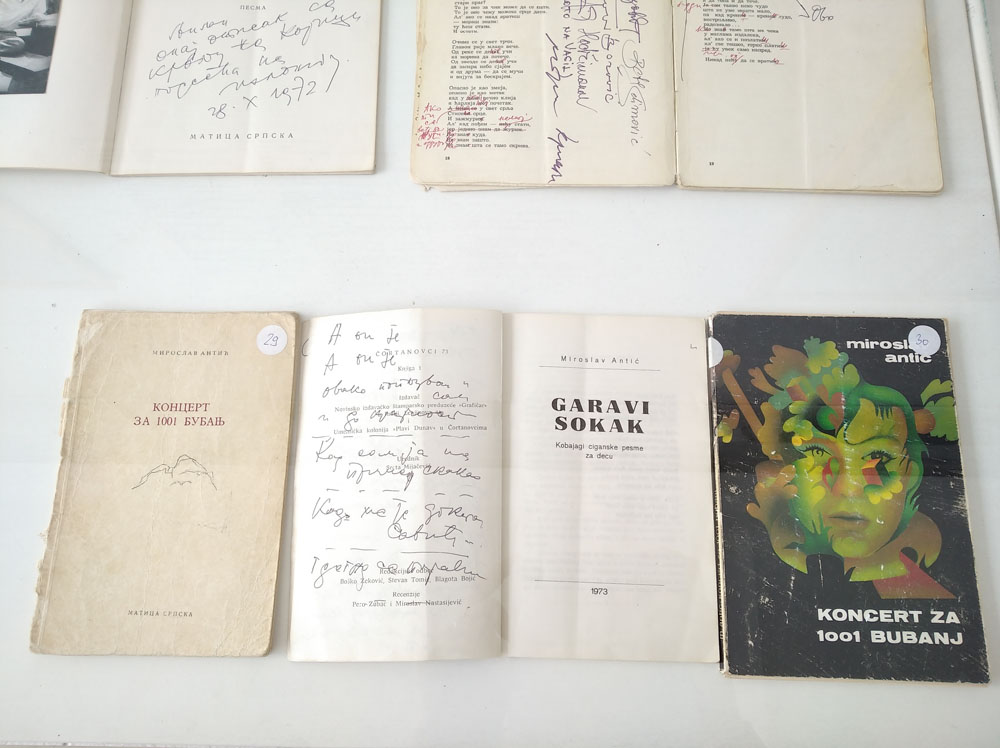 Izložba u Malom likovnom salonu prikazuje prva izdanja knjiga Miroslava Antića sačuvana od strane samog autora i njegove porodice. Na nekima se nalazi posveta supruzi Ljiljani, sebi samom ili oboma, na nekima su uspomene sa književnih večeri, posvete kolega „ludom pesniku burazeru Miki“, kao i potpisi Ferenca Fehera, Desanke Maksimović, Miroslava Nastasijevića, Pere Zupca… Međutim, na stranicama većine knjiga, nalaze se ispravke pojedinih reči, kojima pesnik više nije bio zadovoljan, izbačene su strofe ili čak rukom ispisane čitave nove pesme preko štampanih slova prethodnih, u kojima prepoznajemo stihove koji će se štampati u nekim narednim izdanjima. Tako je 1973. godine, na prvim stranicama prvog izdanja zbirke „Garavi sokak“, u žurbi zapisana i prva skica autobiografske pesme „In memoriam“. Ubrzo zatim se formirala u gotovu pesmu kakvu danas poznajemo i već sledeće godine je objavljena u knjizi „Koncert za 1001 bubanj“, i od onda je kopirana, štampana, citirana i izgovarana bezbroj puta. Na izložbi će biti prikazan, između ostalog rukopis pesme In memoriam, kao i film Peđe Babovića „Čovek od zvezda“ u kojem Miroslav antić govori i stihove ove pesme.