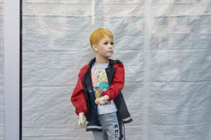 Dečja maneken lutka u izlogu, obučena u prosjaka, sa ispruženom rukom, menja ugao posmatranja izloga, koji inače nude “bolji” život.