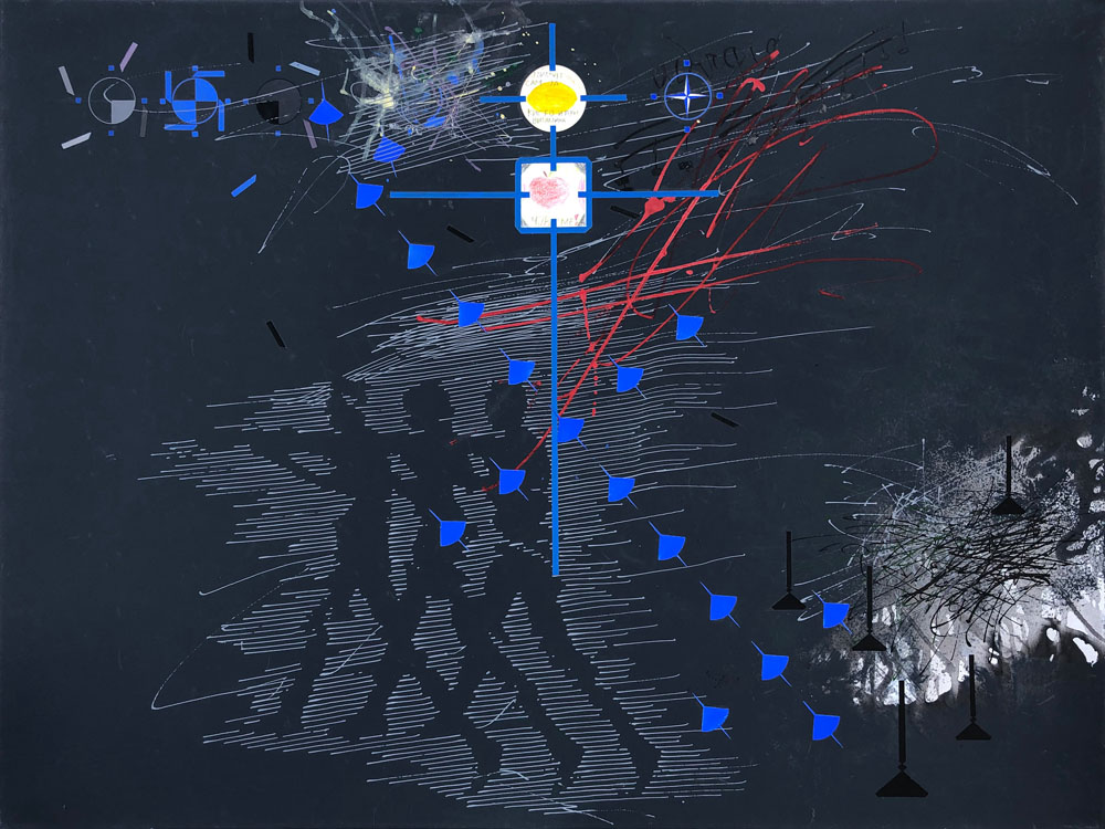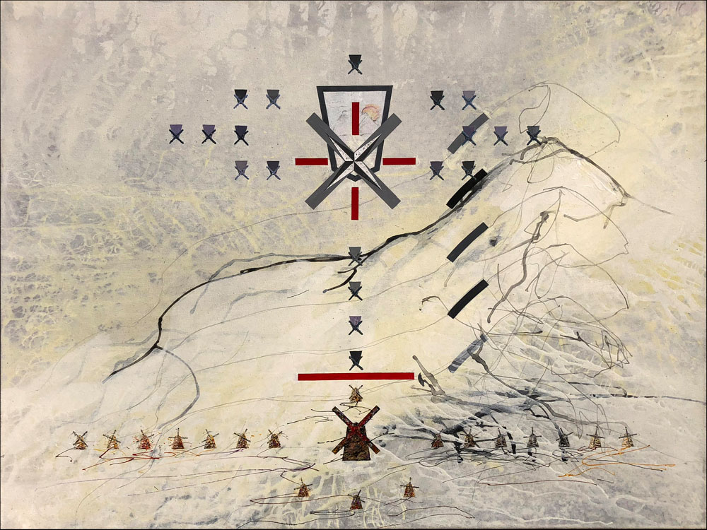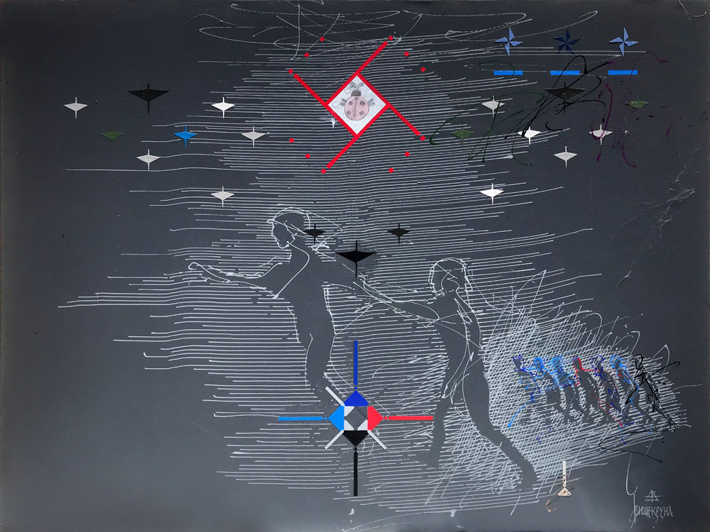 Na prvi pogled upada u oči kontrast između geometrijski preciznih simbola i lakih kaligrafskih crteža. Taj sukob dva stila je nameran i vizuelno treba da dočara antagonizam dva sveta – onih bezdušnih, koji negde iz fotelja gađaju mete, i onih nevinih, koji su se samo zadesili pod ovim parčetom neba. Slikar ne pravi oštru razliku između suncokreta koji se okreću suncu, jelena i konja u galopu, balerina u zanosu igre i ljudi koji beže. I poljoprivreda i kultura predstavljaju naš ekosistem, ono što ovde raste i napreduje i na šta su se obrušile bombe. Naravno, najviše saosećanja ima prema deci.