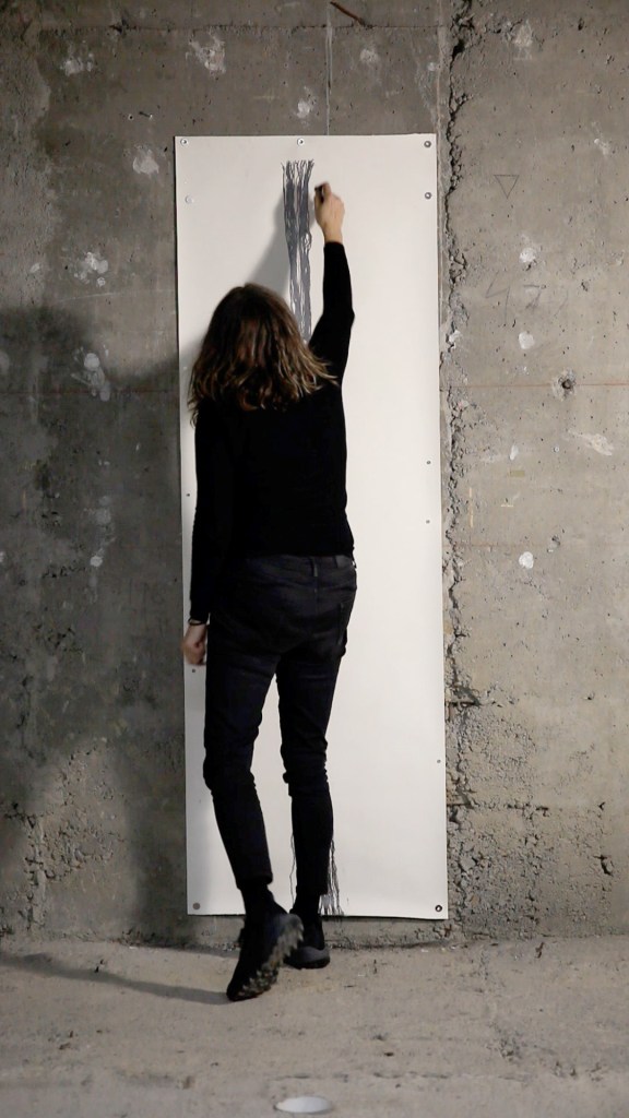 Učesnici su pozvani da tokom petnaest minuta utonu u stanje meditativne prisutnosti. Tokom tog vremena, oni izvode niz neprekinutih, jednostavnih poteza koji funkcionišu kao energetske vertikale: zamišljeni kanali koji povezuju gore i dole, nebo i zemlju, svesno i nesvesno. Svaka linija postaje kratkotrajni zapis životne sile, trenutak kada misaoni proces prelazi u fizičku vibraciju. Ovako nastali crtež ne predstavlja reprezentaciju već trag same suštine života.